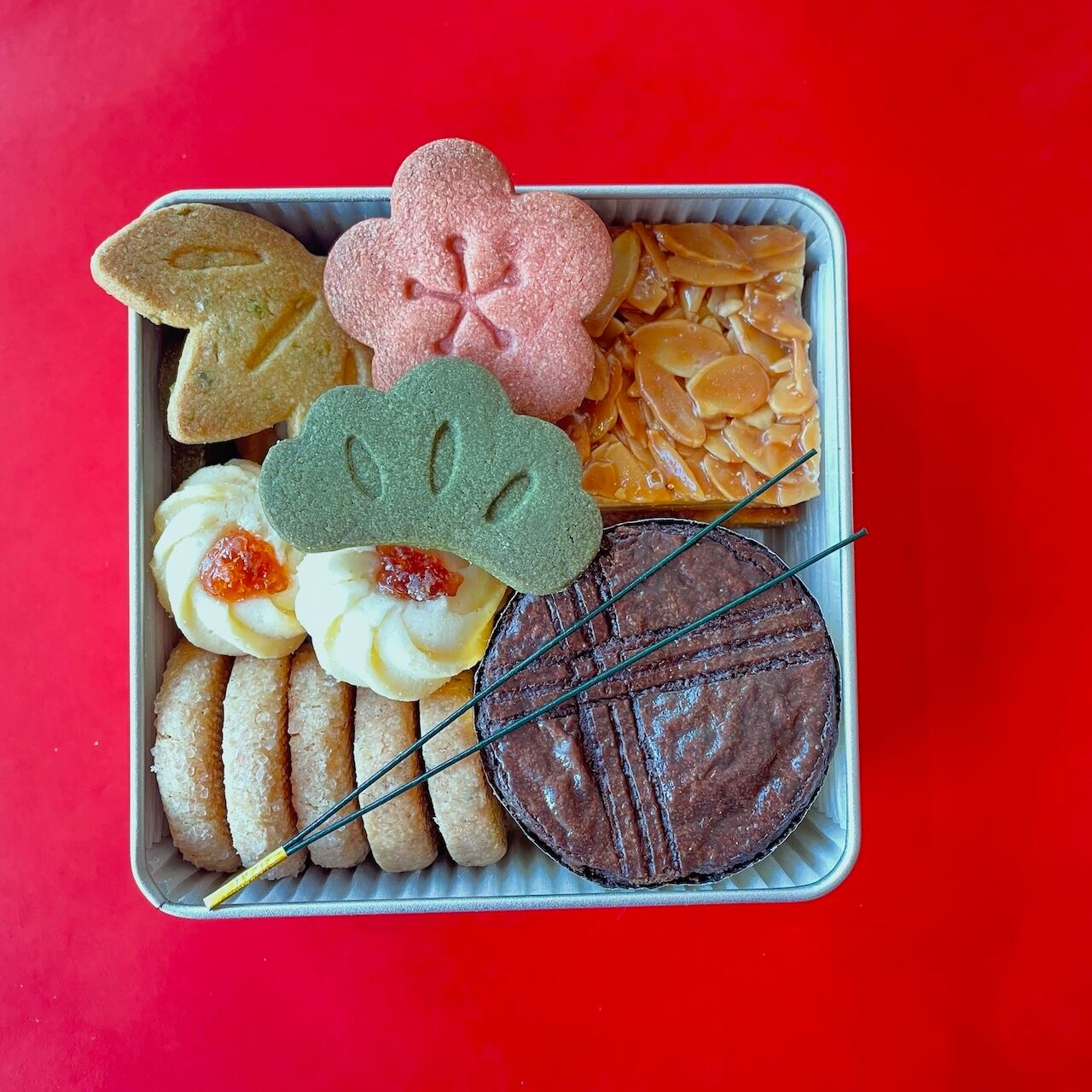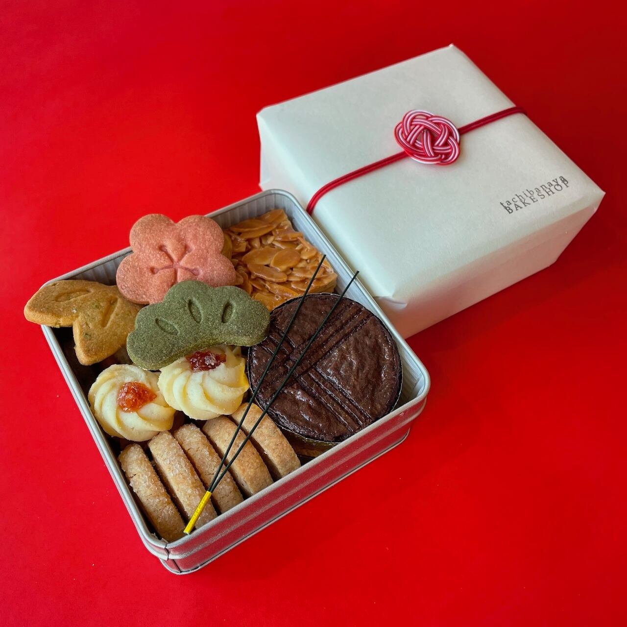 シンプルな缶にギッシリ詰合せた、クッキー缶。お正月限定詰め合わせ&パッケージです。