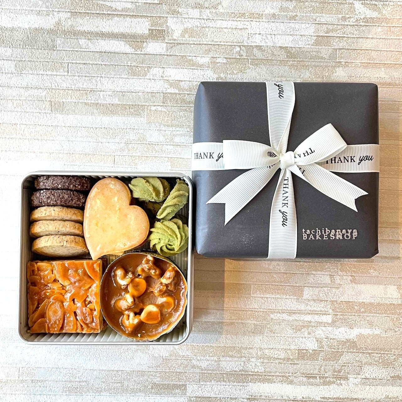 さっくりとしたサブレベースに、香ばしくローストしたクルミやマカダミアナッツなどの木の実をのせ、クリーミーなキャラメルを重ねた新作の焼菓子です。