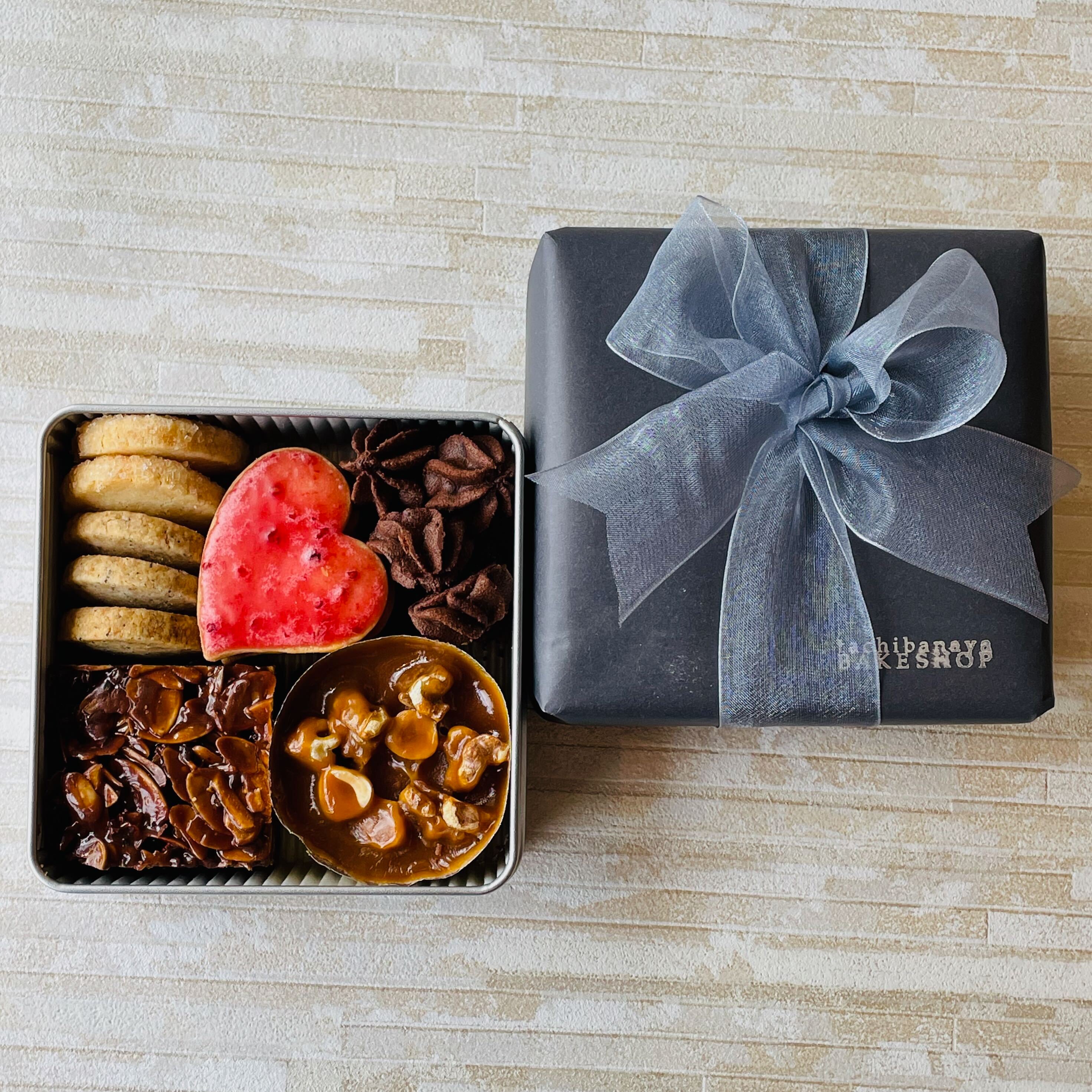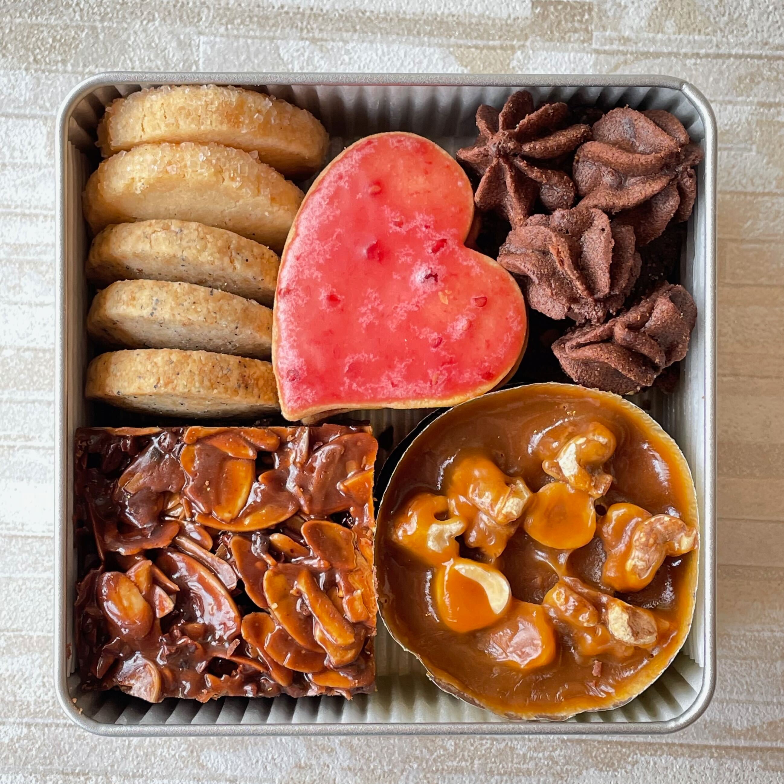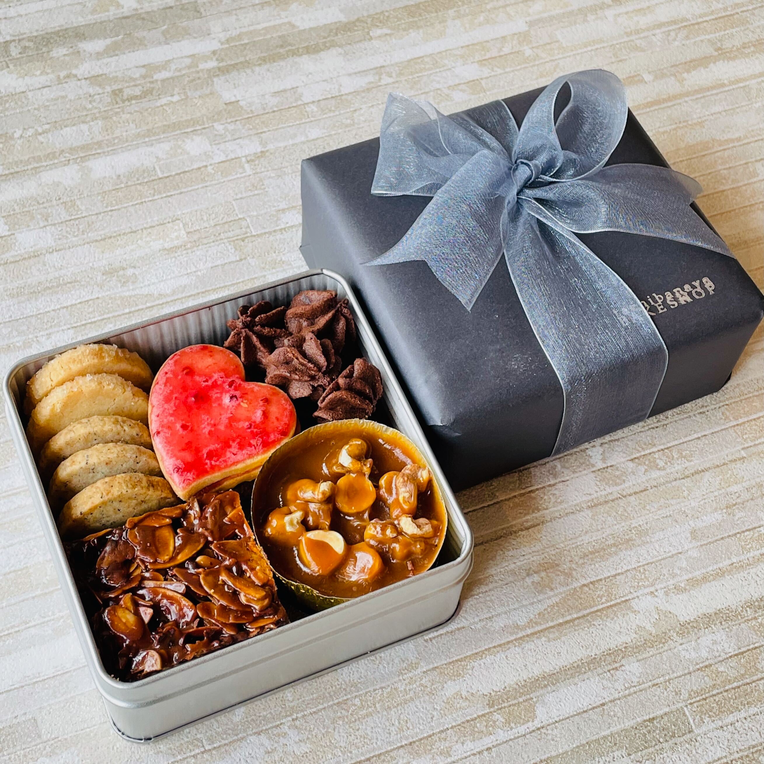 シンプルな缶にギッシリ詰合せた、クッキー缶。バレンタインデーをイメージした詰め合わせです。