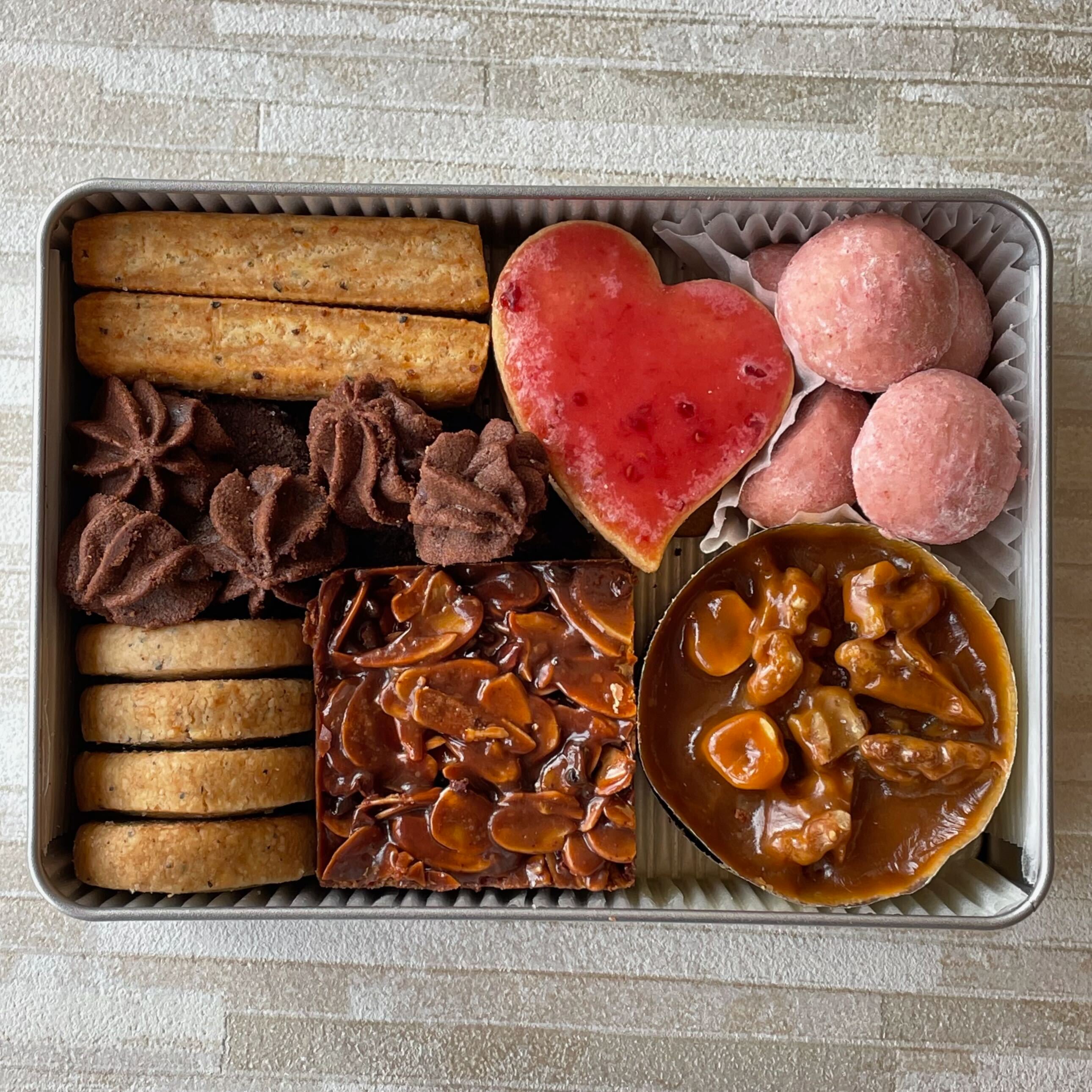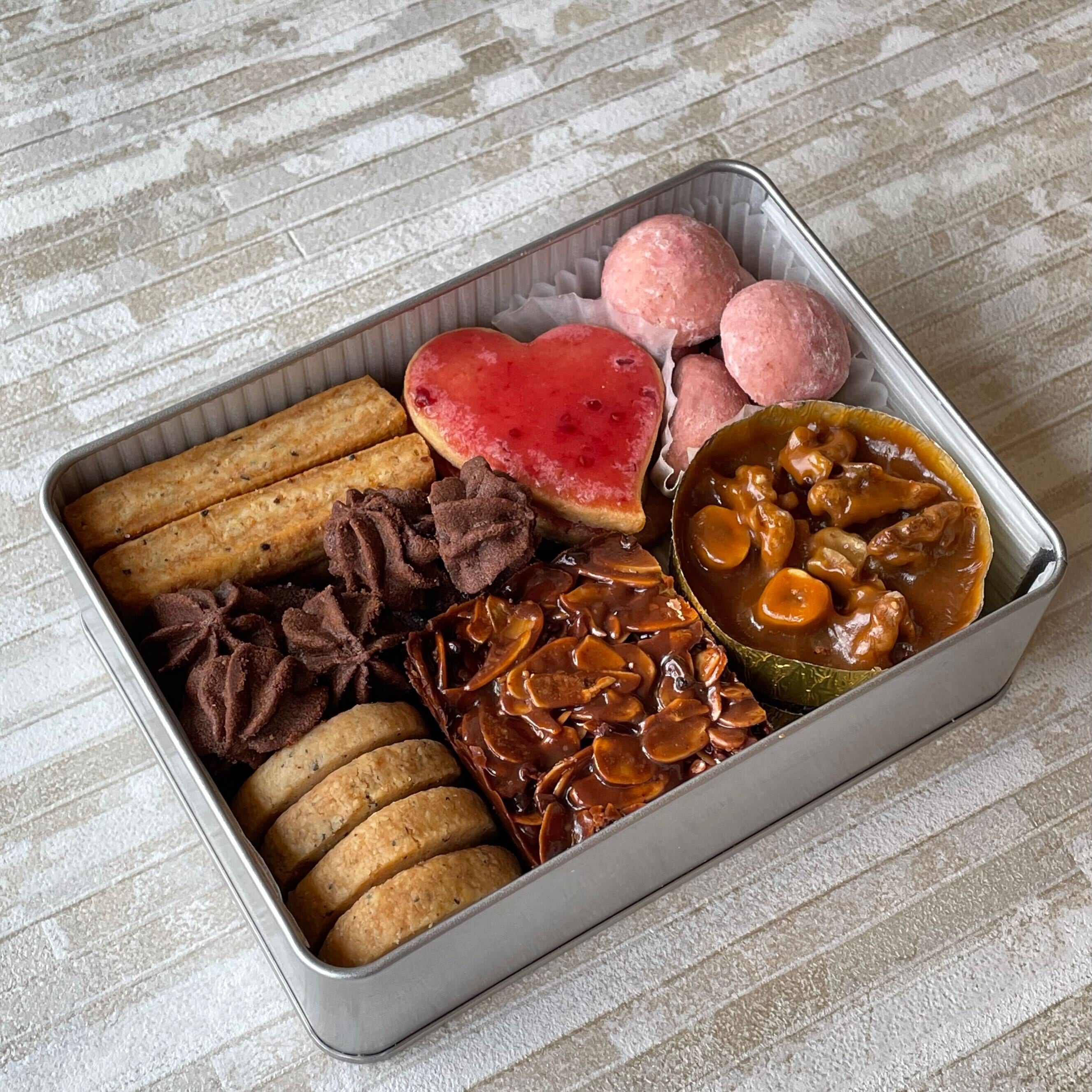 シンプルな缶にギッシリ詰合せたクッキー缶。バレンタインデーをイメージした詰め合わせです。