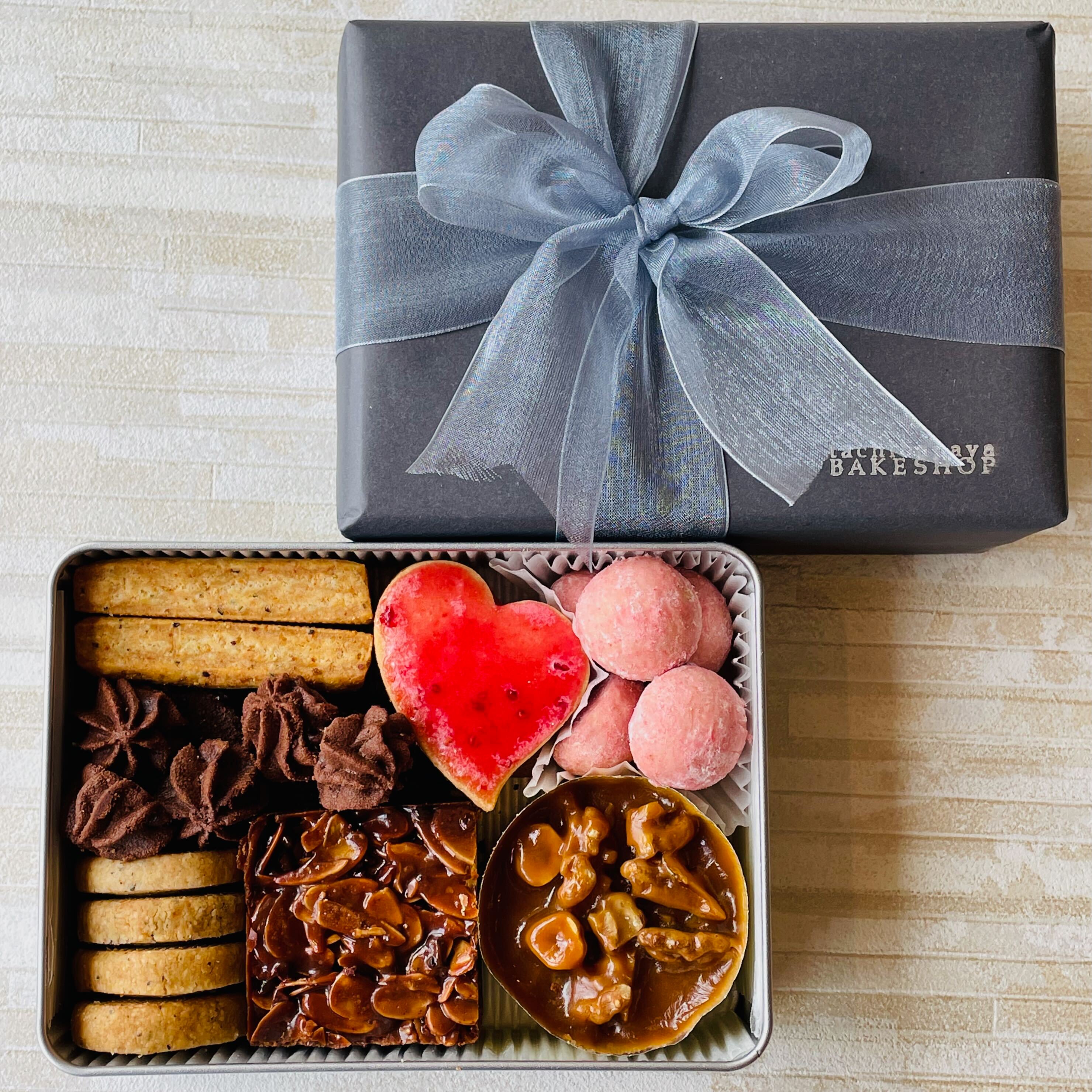 シンプルな缶にギッシリ詰合せたクッキー缶。バレンタインをイメージした詰め合わせです。